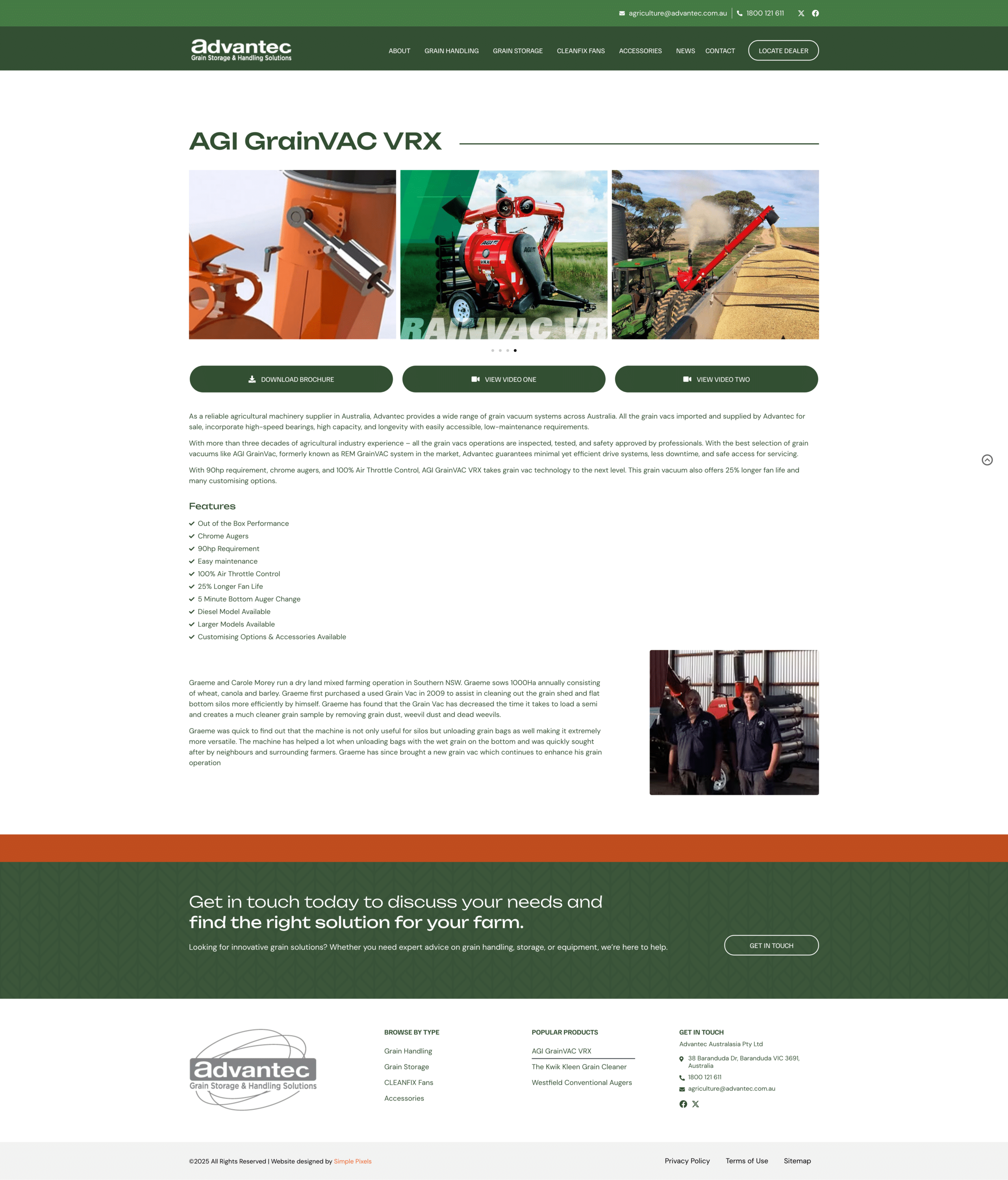 As the leading Australian importer of AGI GrainVacs and a dealer of AGI Westfield products, Advantec offers an extensive catalogue, including augers, conveyors, silos, and grain cleaners.