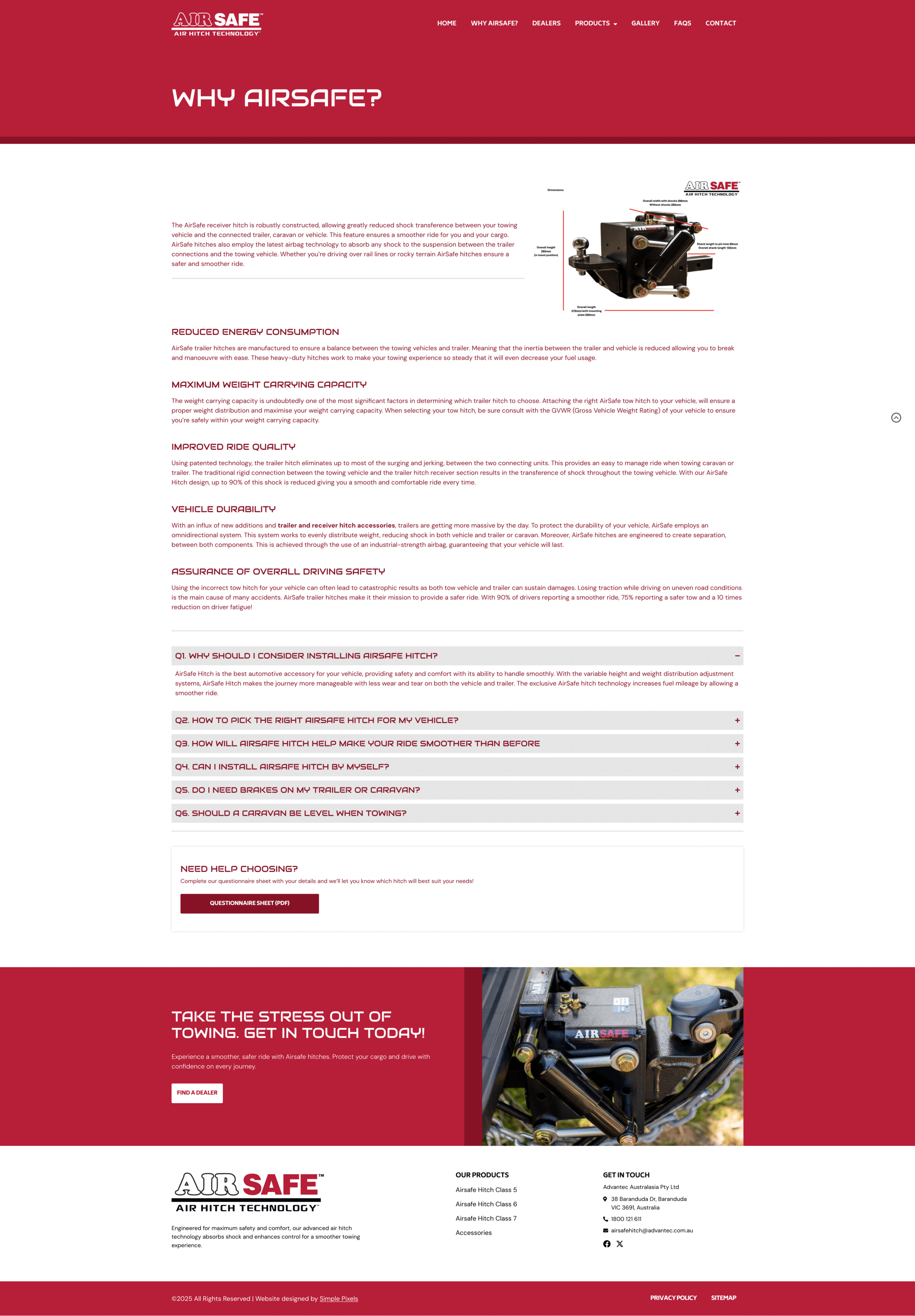 Featuring the latest airbag technology, AirSafe hitches absorb shocks to the suspension, improving ride quality over rough terrain or rail lines. Their hitches are engineered to reduce energy consumption by balancing the towing vehicle and trailer, making towing more efficient.