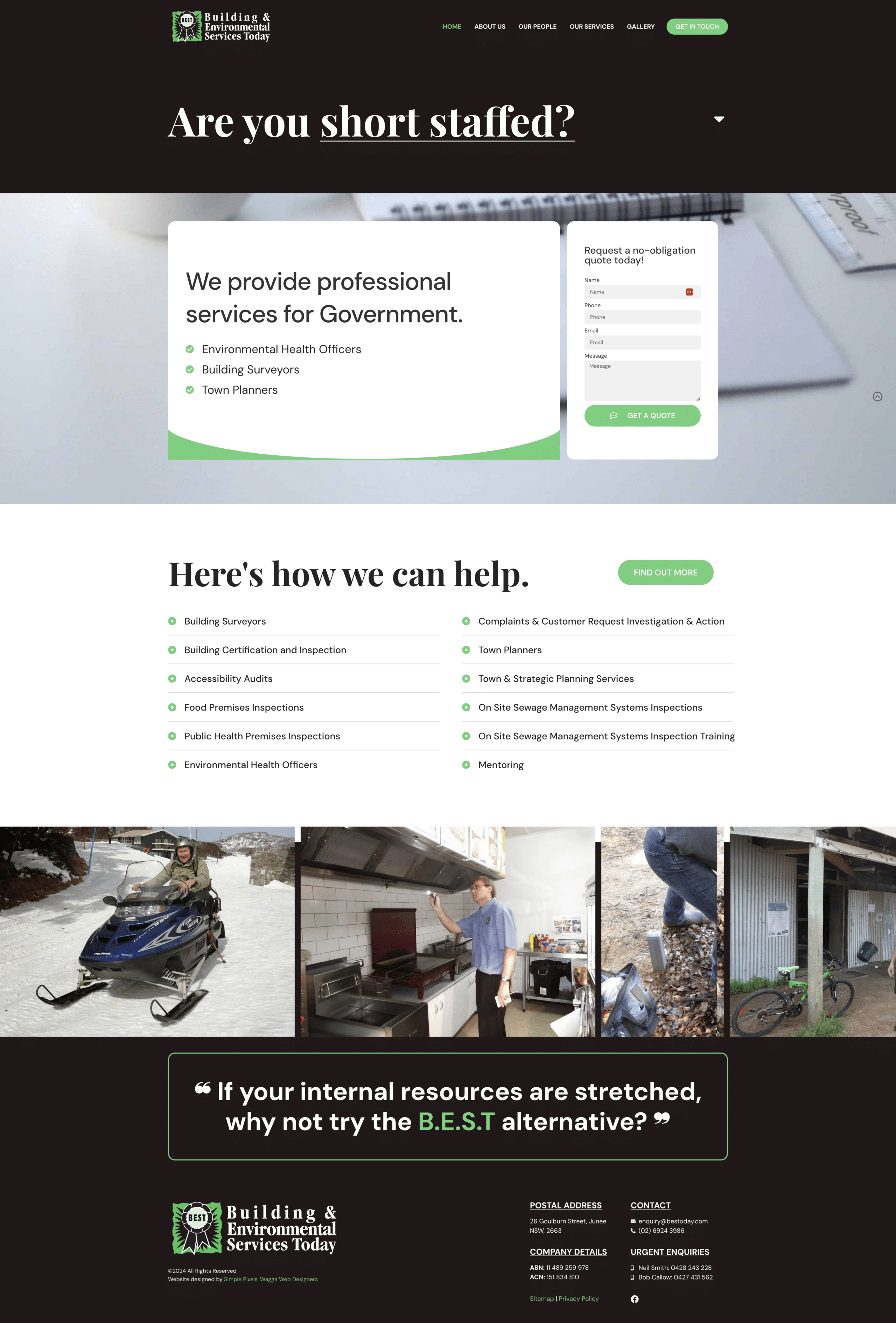 B.E.S.T, established in 2000, provides professional services to local governments and councils, offering flexible support to complement existing resources. Over 50 councils and government bodies have utilized their expertise to handle tasks that require additional time or specialised experience. They offer a range of professional services including building surveyors, building certification and inspections, accessibility audits, food and public health premises inspections, environmental health officers, as well as support for complaints and customer request investigations, town and strategic planning services, on-site sewage management system inspections and training, and mentoring.