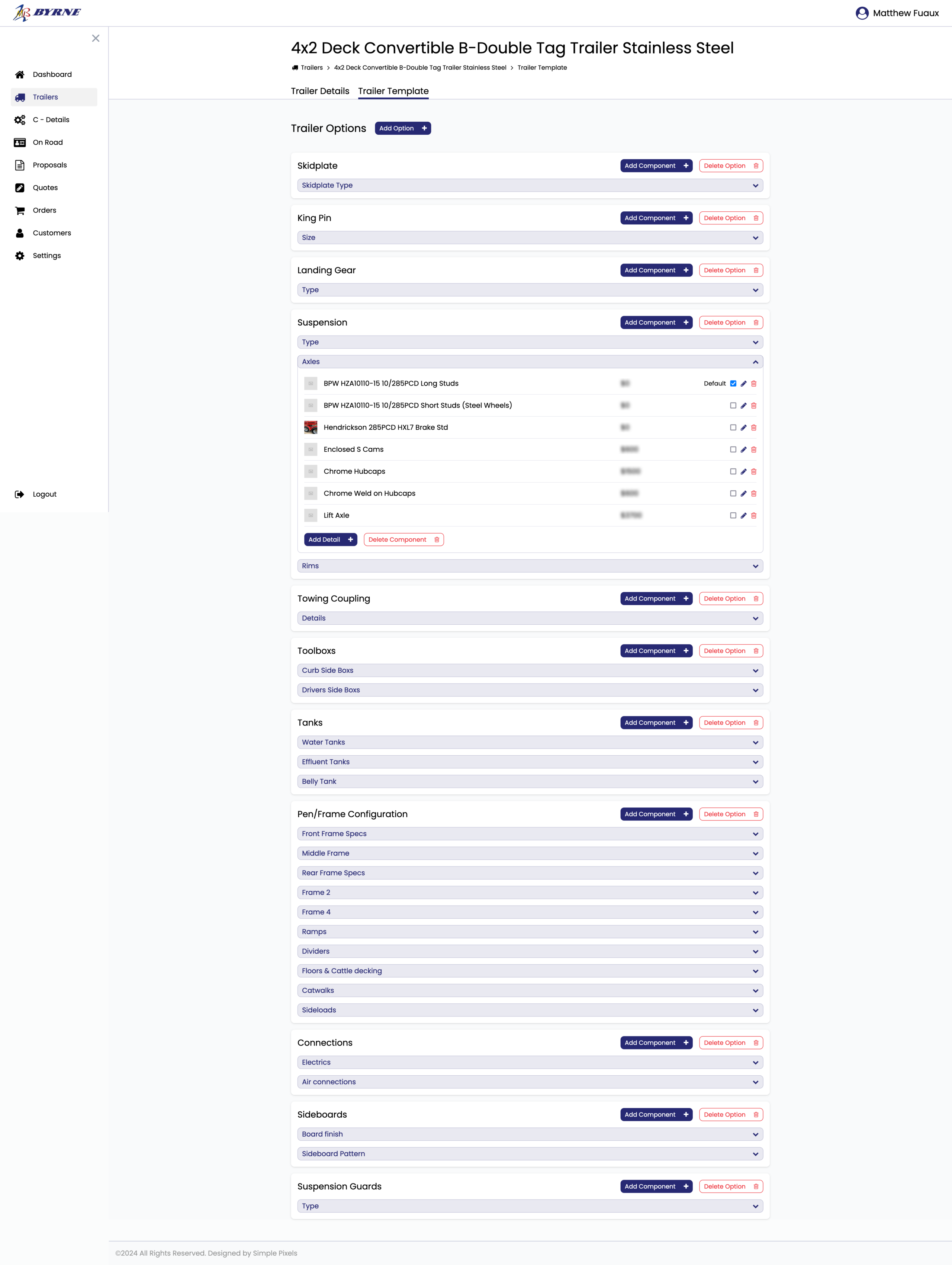 A bespoke cloud-based software system meticulously crafted for Byrne Trailers, this platform facilitates the streamlined management of diverse trailer components. These components are seamlessly stored in a robust database, allowing for effortless modification of pricing, descriptions, and models. Leveraging an intuitive templating module, users can effortlessly assemble these components into a myriad of trailer configurations, providing an extensive array of customisable options.