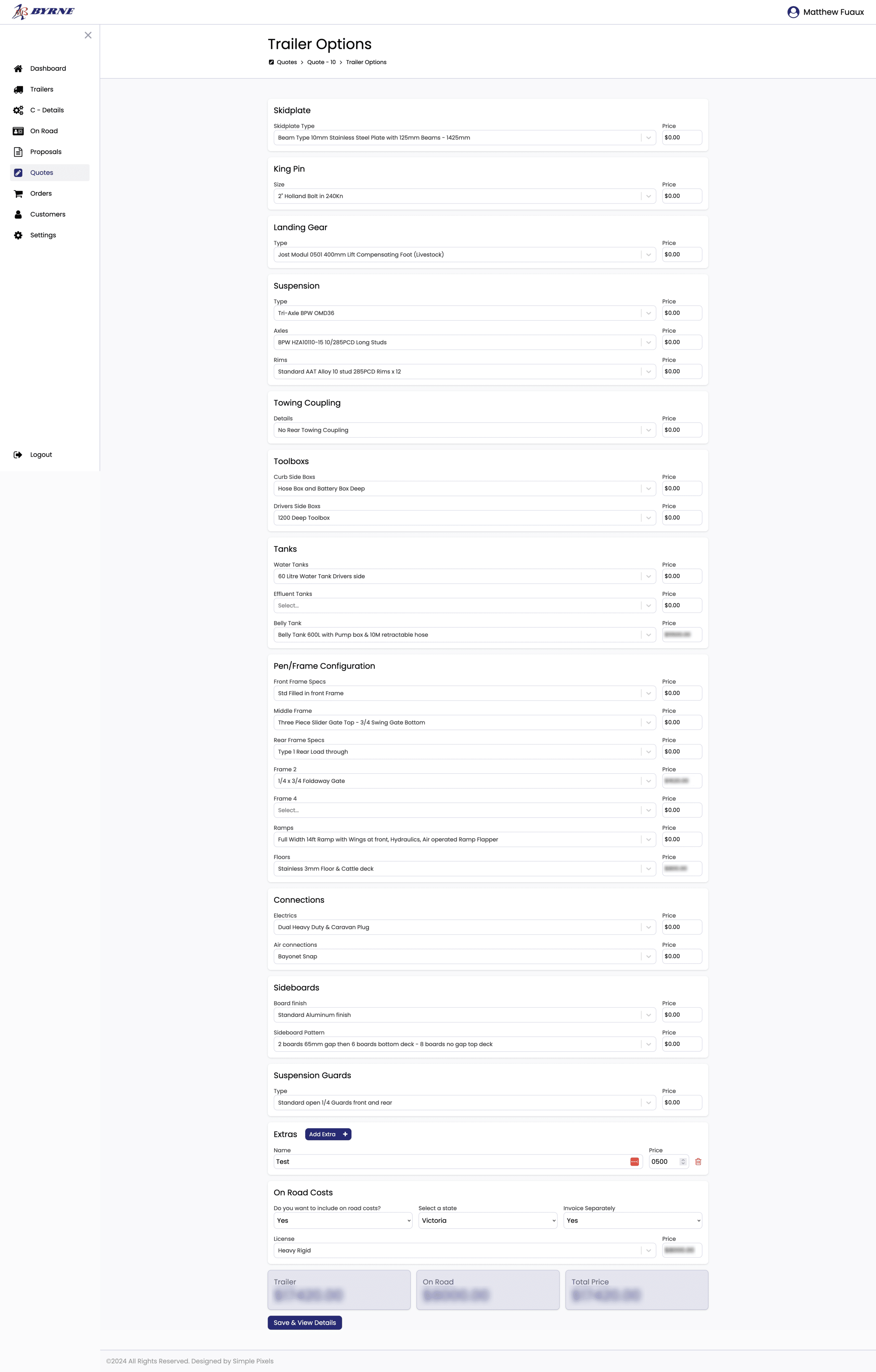 The process of generating quotes is made effortlessly efficient through the selection of a trailer template, followed by the customisation of specific options tailored to the customer’s preferences. The system automates the calculation of the quote price and incorporates additional costs such as on-road extras.