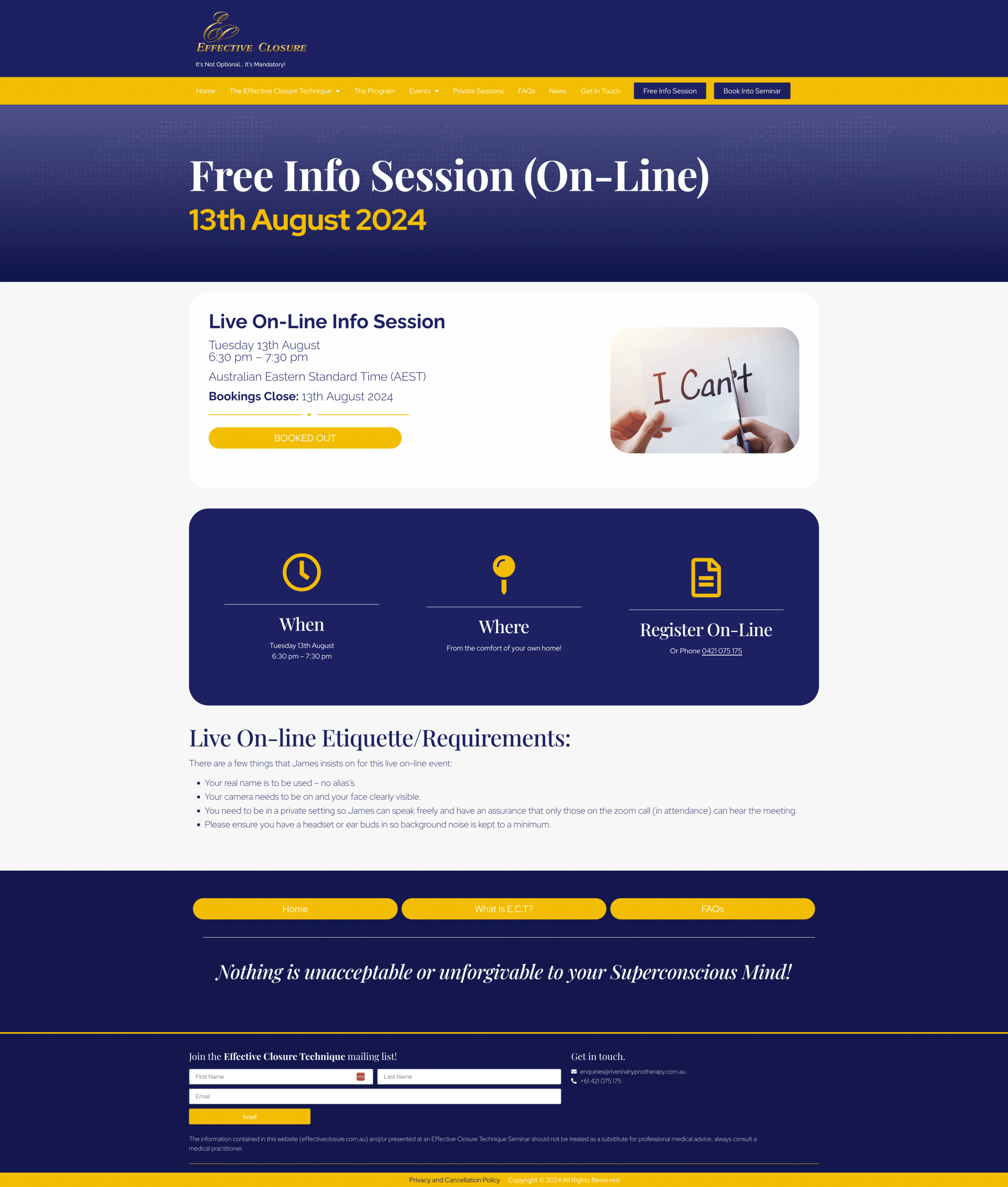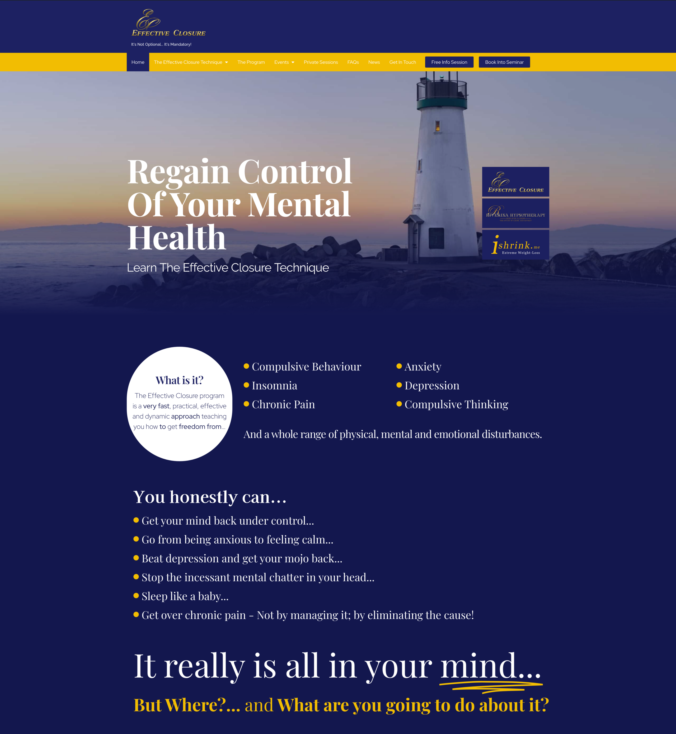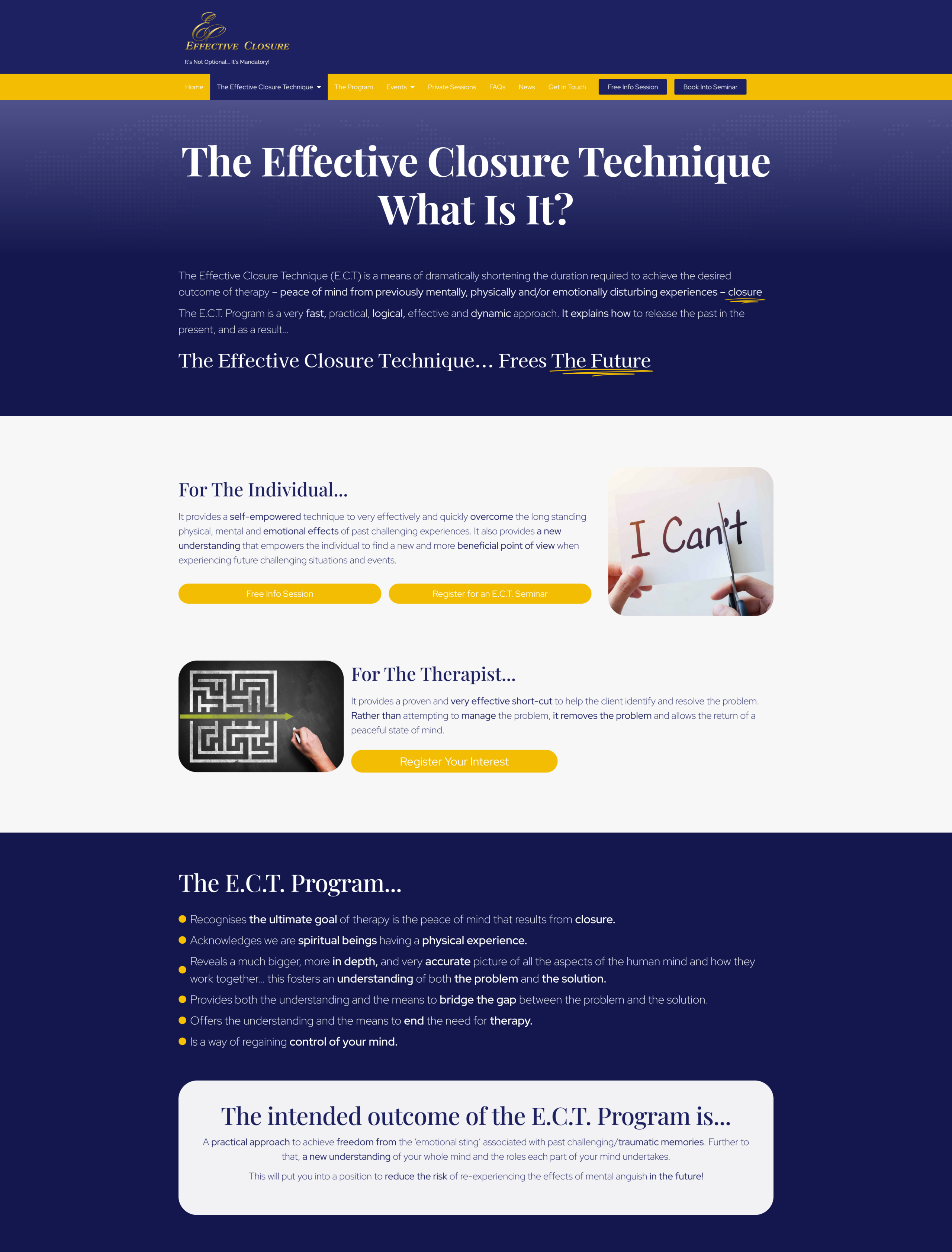 The Effective Closure Technique (E.C.T.) is a means of dramatically shortening the duration required to achieve the desired outcome of therapy – peace of mind from previously mentally, physically and/or emotionally disturbing experiences – closure.
