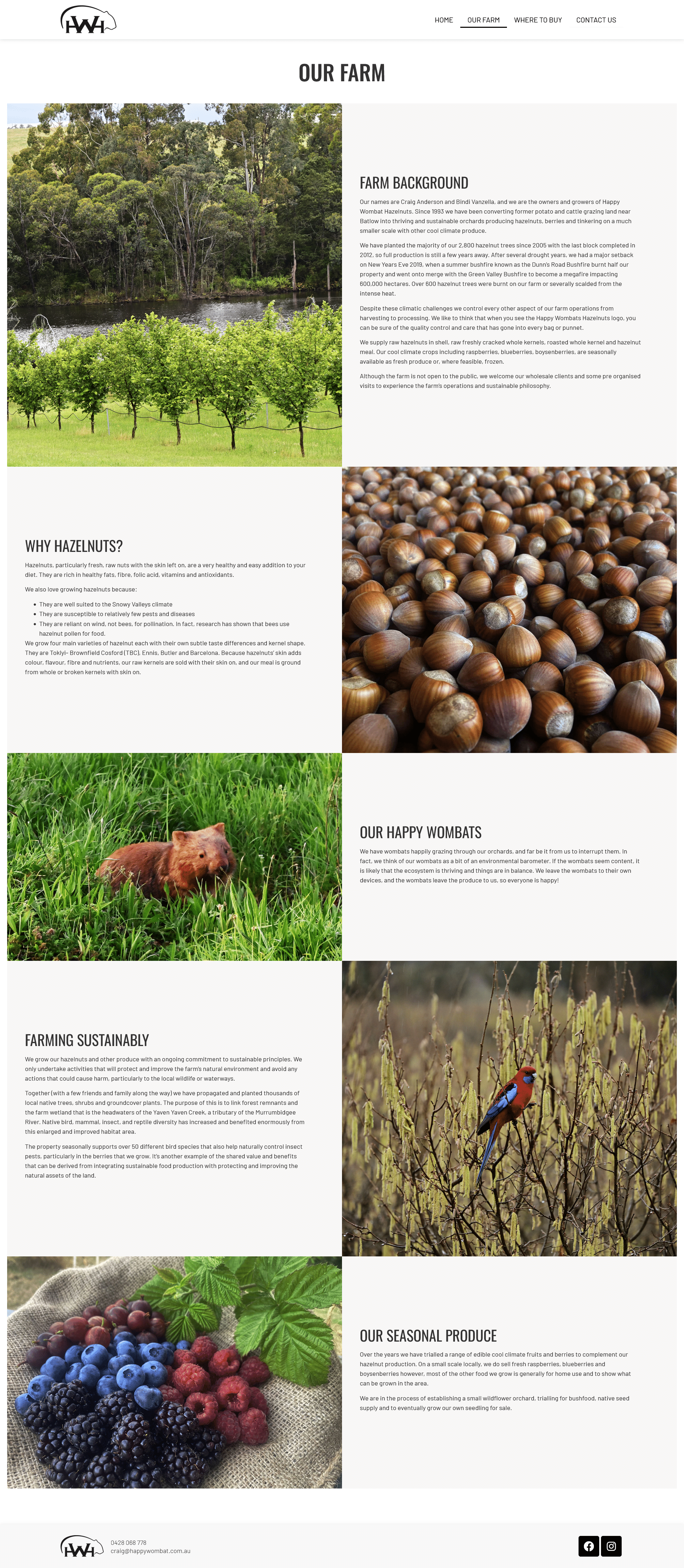 Welcome to Happy Wombat Hazelnuts, your source for a delightful variety of hazelnuts in NSW. Our website design for Happy Wombat is as fun and enjoyable as the hazelnuts they provide. With an emphasis on vibrant imagery and showcasing the product and farm, we’ve created a platform that mirrors the joy and quality of Happy Wombat Hazelnuts.