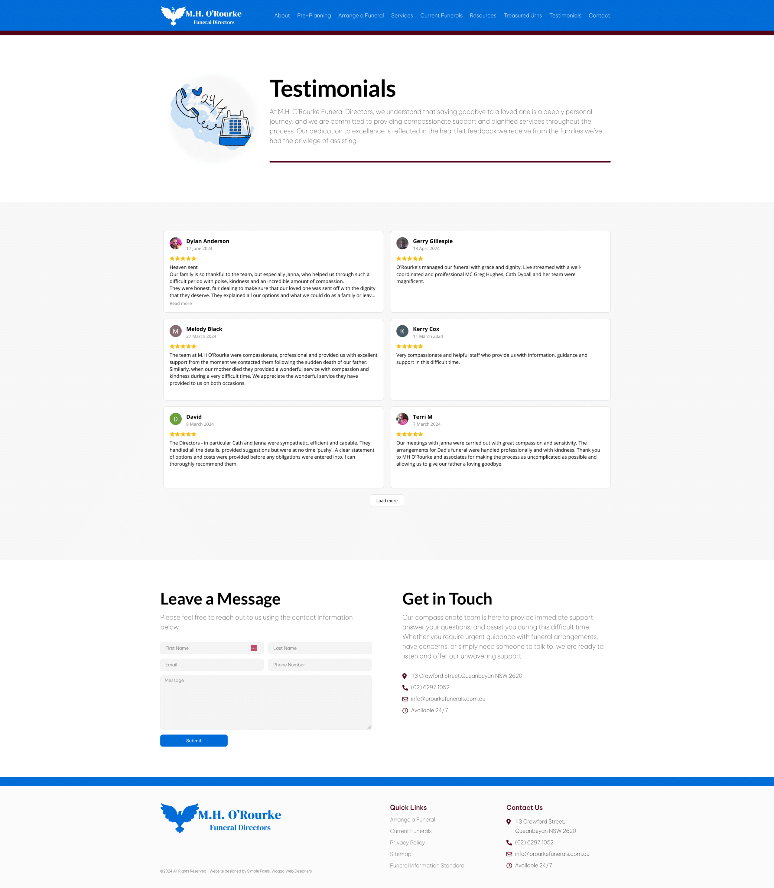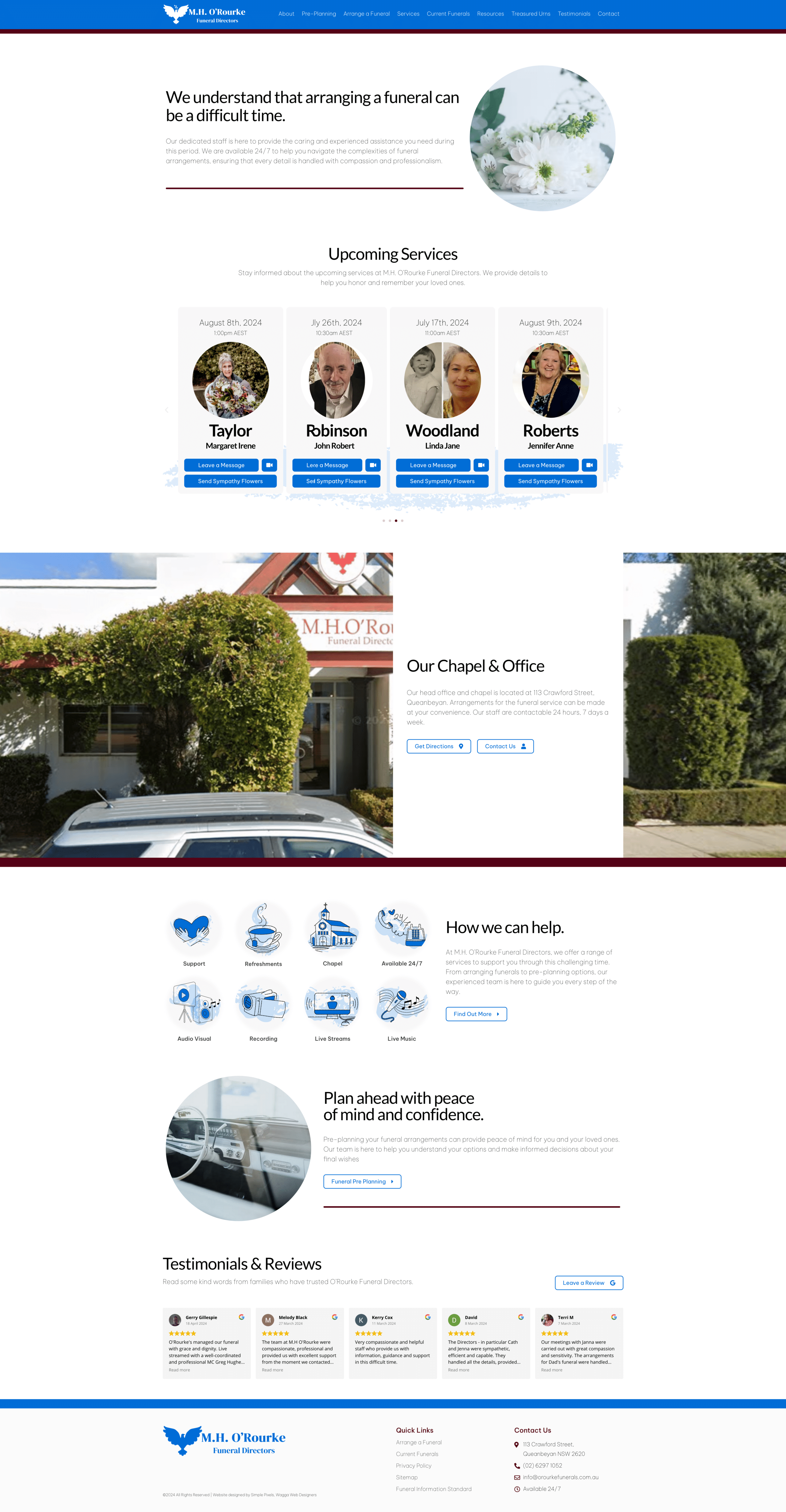MH O’Rourke Funerals, established in the late 1890s in Queanbeyan, has been serving families for over 100 years. The business, originally started by Cornelius and expanded by his sons, relocated to 113 Crawford Street in 1929, where it still operates today. In 1987, the Allison family, with a long history in the funeral industry, acquired the business. The site has been refurbished in 1995 and 2010, continuing their legacy of compassionate funeral services.