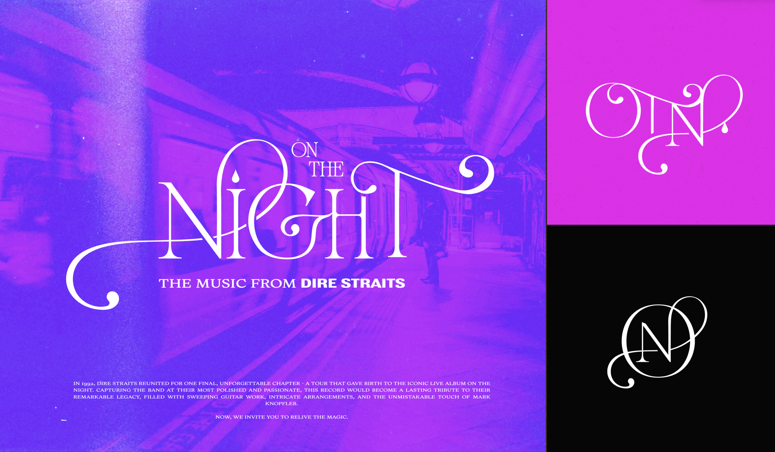 Dire Straits has directly inspired the brand look for On The Night. Not only through their music, but their attitude. On the Night’s brand gives homage to the ‘Money For Nothing’ music video and the band’s original logo. By combining  film painting, rotoscoping, collage, and traditional art nouveau styles, we’ve created a look that is super distinct yet familiar to the heart. It’s organic, loud and breaks stereotypes, just like the most influential music of the latter 20th century.