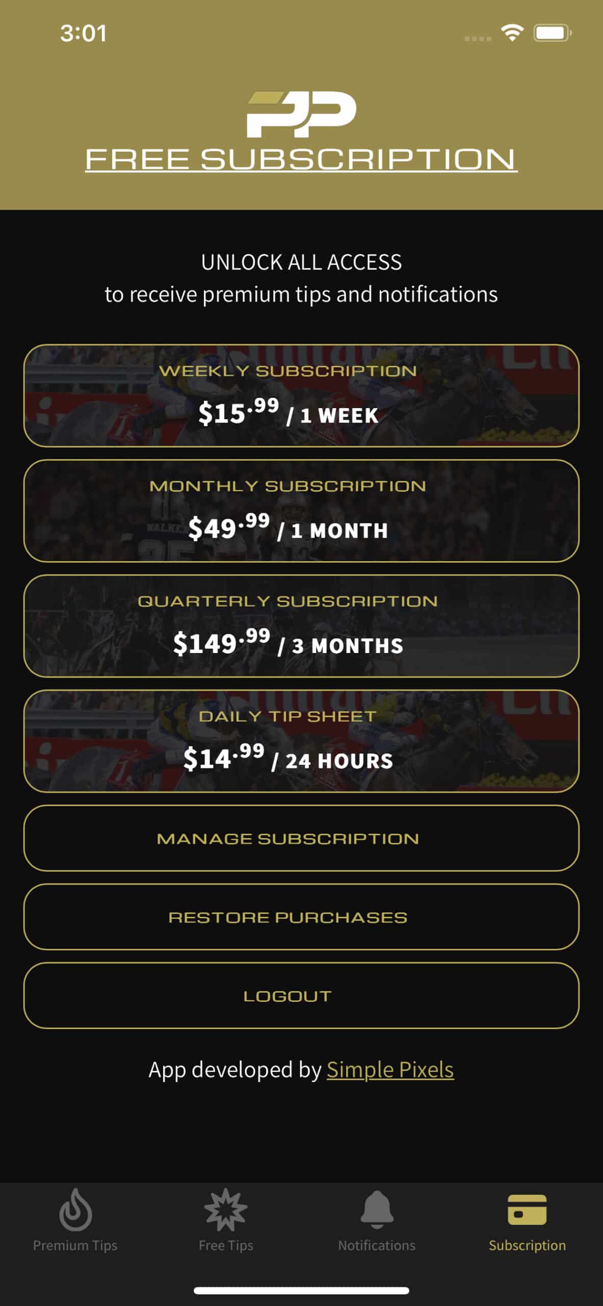 In tandem with the development of their website, the Premium Punter mobile application offers enhanced accessibility, allowing members to access tips from anywhere. This application enables users to conveniently manage their subscriptions via the app store and receive prompt push notifications for real-time updates on the latest tips. Never miss a tip! The content within the application is seamlessly managed through their WordPress site, ensuring straightforward administration.