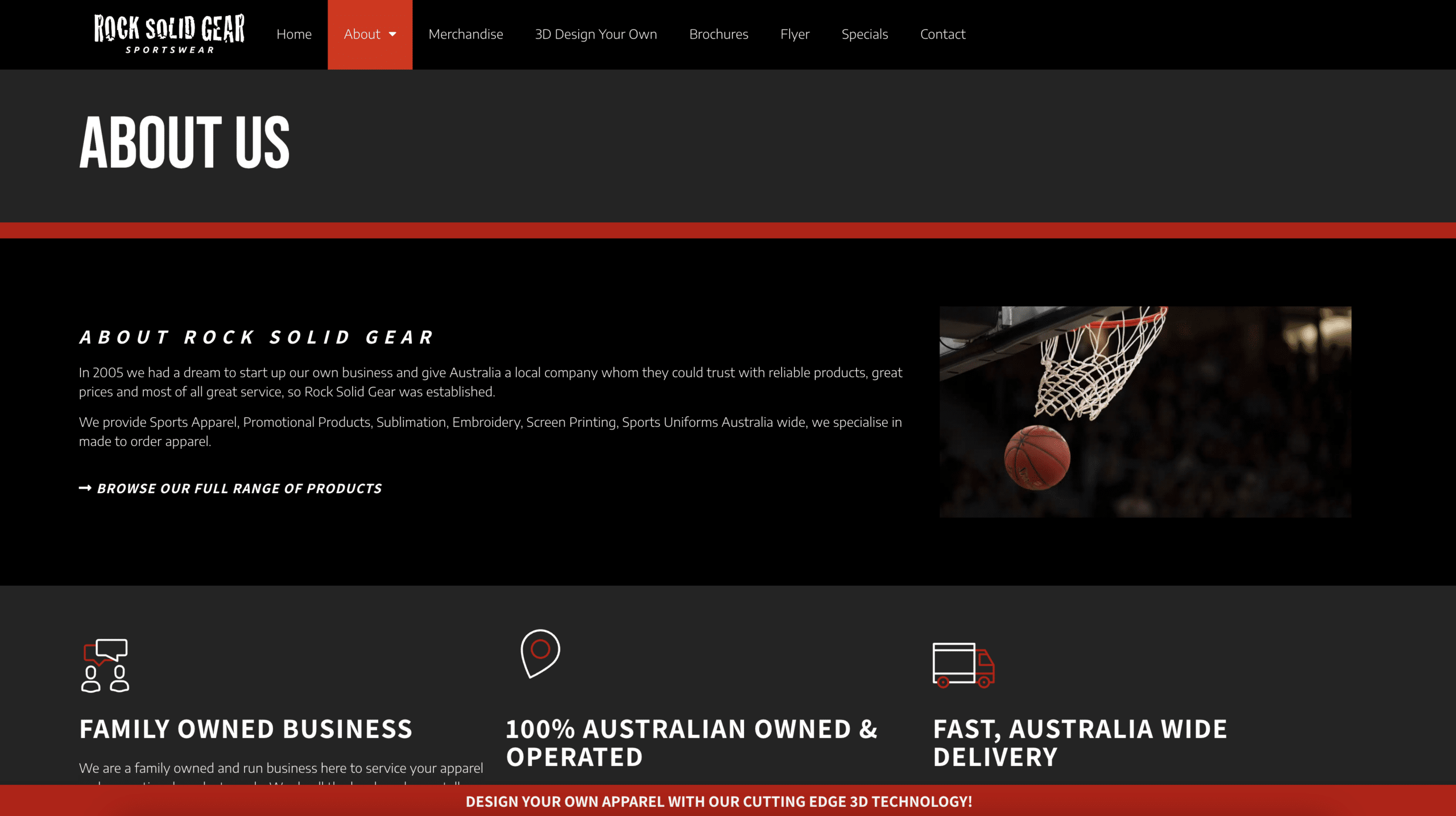 Rock Solid Gear is your Australian go-t0 provider for sports apparel, promotional products, sublimation, embroidery, screen printing, and sports uniforms nation wide. Forget cheap, overseas imports, Rock Solid Gear products are made to order. Better yet, design your own goods using their specially developed interactive sportswear designer.